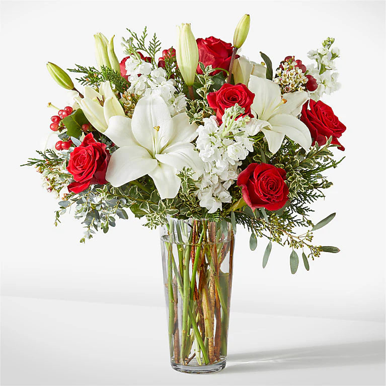 Celebrate the season with The Festive, a stunning holiday arrangement that brings warmth and elegance to any space. This carefully curated bouquet features luxurious roses and graceful lilies as the focal point, creating a sophisticated blend of color and texture. Perfect for gifting to loved ones or brightening your home during the festive period, this arrangement captures the spirit of the holidays with timeless florals that symbolize love and beauty. Each stem is hand-selected to ensure freshness and visual impact that lasts.